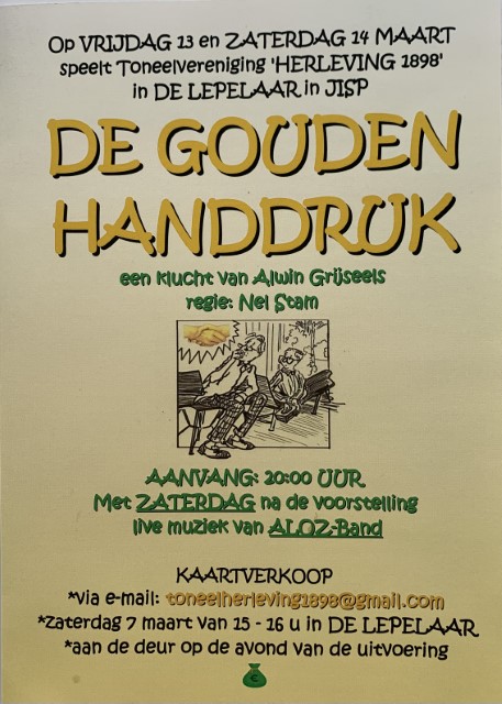 Op vrijdag 13 en zaterdag 14 maart aanstaande speelt toneelvereniging ‘Herleving 1898’ de klucht ‘De Gouden Handdruk’ van Alwin Grijseels.